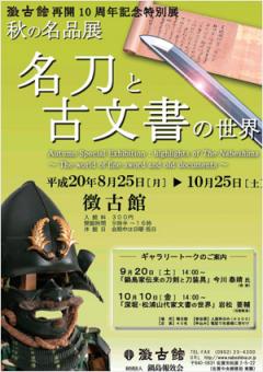 徴古館再開10周年を記念して鍋島家伝来の名品を夏・秋・冬の三期に分けて紹介した名品展の第2弾。本展は佐賀藩主佩刀を中心とする名刀の世界、佐賀鍋島藩で要職を務めた家老の深堀家、着座の松浦山代家に伝わった武家文書や国内随一の高麗経などの古文書の世界を、具足や国絵図などと共にご紹介しました。