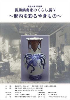 明治・大正期の侯爵鍋島家の邸内で、和洋折衷の客間を飾った大型の花瓶や置物、食卓を彩った洋食器など、香蘭社や深川製磁の製品を中心とする色鮮やかな近代磁器の名品を展示しました。また、鍋島邸内の古写真にうつされた掛軸や花瓶、鼻紙台といった豪華な調度品もあわせて展示しました。