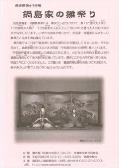 鍋島家ゆかりのおひなさまが四国・宇和島の地から里帰りしました。宇和島伊達家と鍋島家の縁組は3代にわたり、おひなさまの持主である観姫(みよひめ)は、8代藩主・鍋島治茂の女(むすめ)で、7代宇和島藩主・伊達宗紀公に嫁ぎ、幕末に江戸から宇和島に移り住み、明治3年に亡くなりました。本展では、観姫から御付の染川に下げ渡され、子孫の山下家で守り伝えられた雛人形・雛道具類を紹介しました。