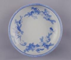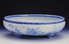 見込みに、水草に遊ぶ8匹の金魚をあらわした涼しげな一品。外側に表された牡丹・菊・蓮・ススキ・桔梗・撫子・萩・女郎花などの草花は、晩夏から秋の涼風を感じさせる。鍋島家は他の旧大名家と同様、明治以降は東京に住まれた。有田・香蘭社製のこの鉢は、永田町の鍋島邸内で実際に水を張り金魚を泳がせていたのだろうか。