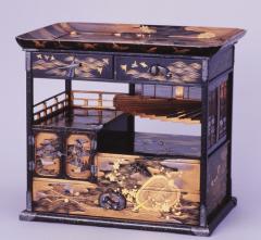 10代藩主鍋島直正の長女で川越松平家へ嫁いだ貢姫(みつひめ/1839年~1918年)所用の鼻紙台。鼻紙台とは懐紙や楊枝など手回りの小物を整理して入れるためのもの。中段の棚を扇面の形につくり、側面には欄干や御簾を取り付けて寝殿風にするという、瀟洒で技巧を凝らしたつくりである。